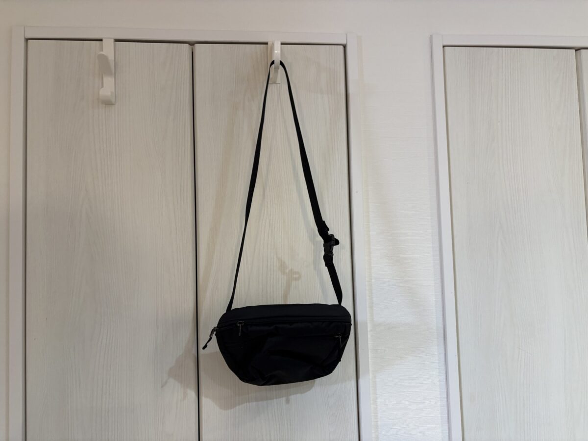 ストラップの細さについても「肩に食い込まないか」と心配していたのですが、財布・鍵・スマホ程度の重さであれば実際には気にならないレベルでした。薄手のジャケット越しでも、Tシャツ一枚でも、今のところ問題なく使えています。