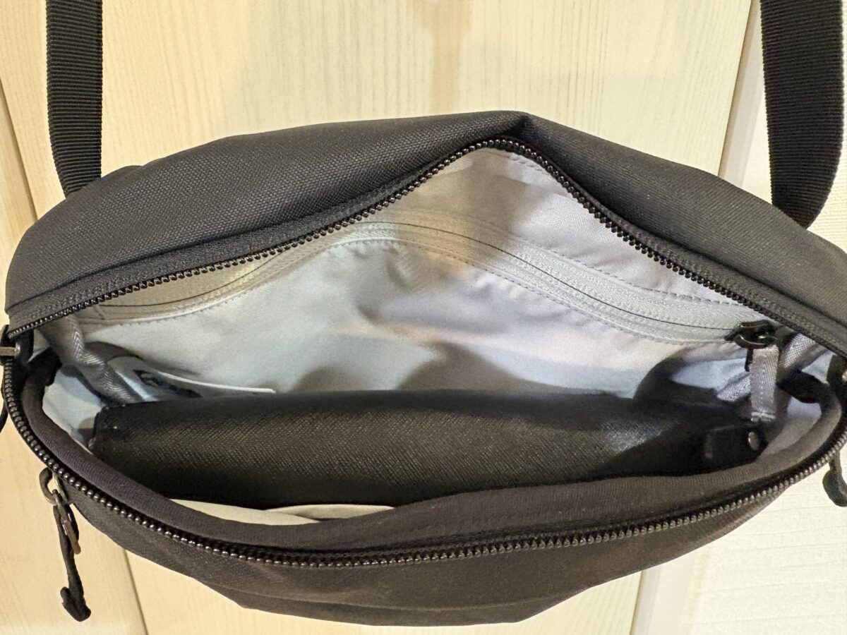 長財布を使っている方にとって、この差はけっこう大きいと思います。マンティス2は容量2.5Lで、長財布・スマホ・鍵・イヤホン・モバイルバッテリーが一通り入るサイズ感です。重さは約190gと軽く、持ち出すのに気負いがありません。