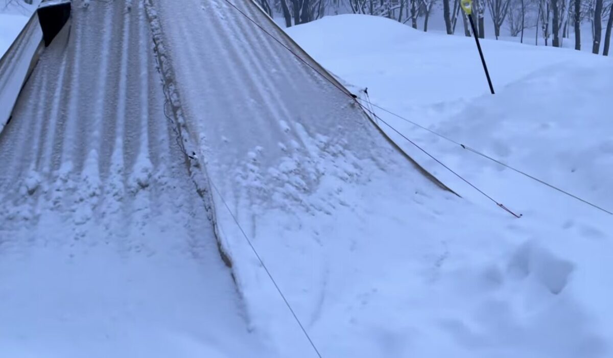 私もワンポールテントで雪中キャンプをしたことがありますが、外から見ると「倒壊しそうだな」「ポール折れそうだな」「生地が破れそうだな」と心配になるような状態でした。知り合いのキャンパーの中には、実際に放置していたテントが倒壊したという話も聞いたことがあります。