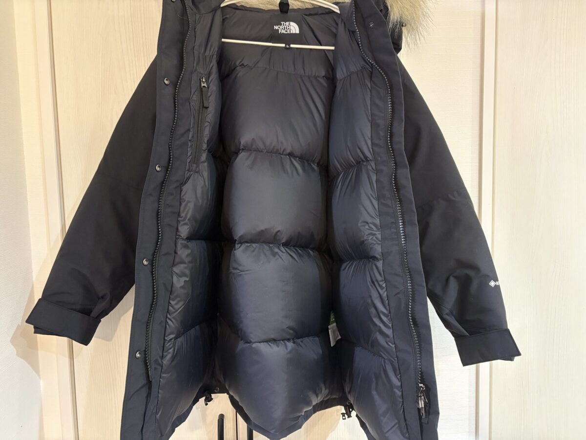 試着した瞬間、「あれ?これダウンなのに全然モコモコしてない!」と驚きの声。確かに、アンタークティカパーカのような重厚感はなく、シュッとスリムに見えるシルエットでした。