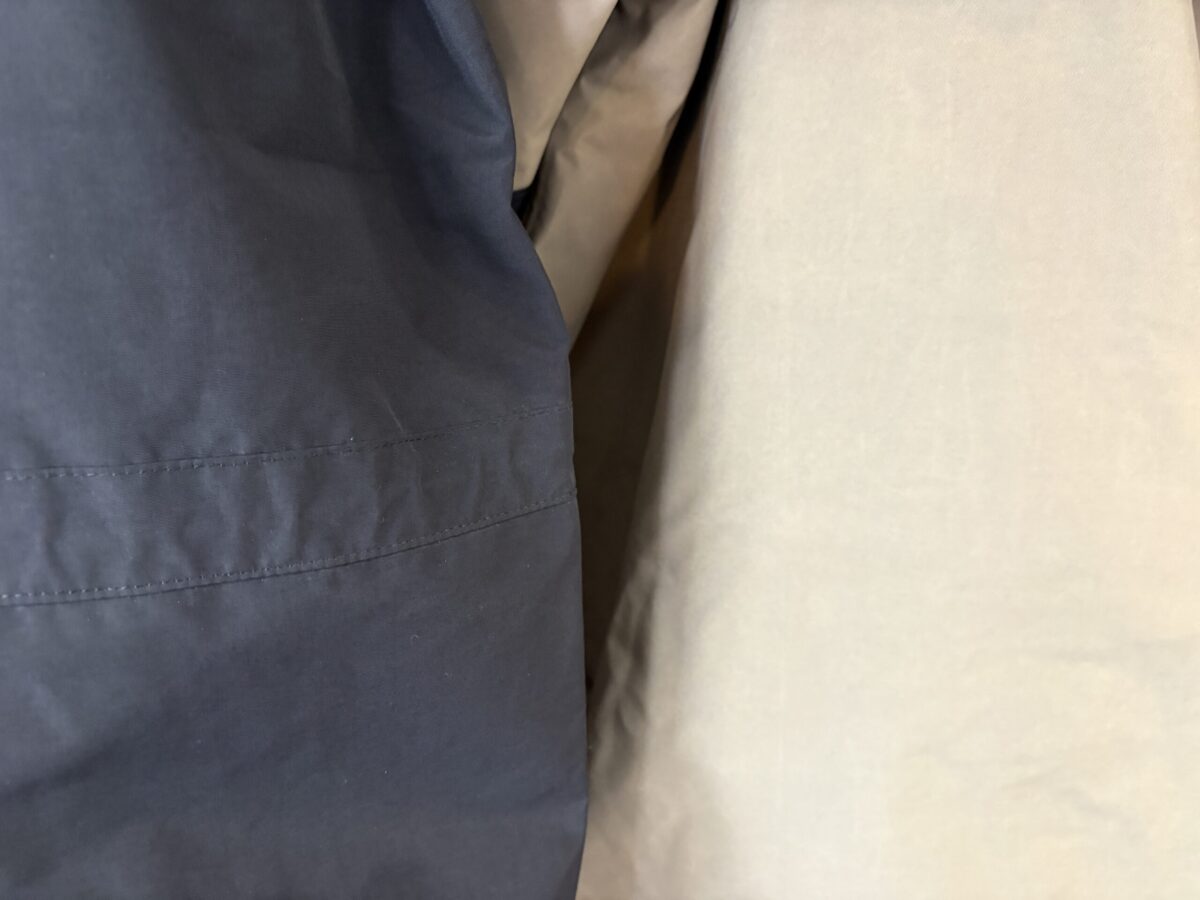 生地の厚みは150デニール。触った瞬間に「これは本気の生地だ」と分かる、ハリと重厚感があります。風を受けてもバシッと形を保つ感じは、マウンテンライトとは明らかに違います。