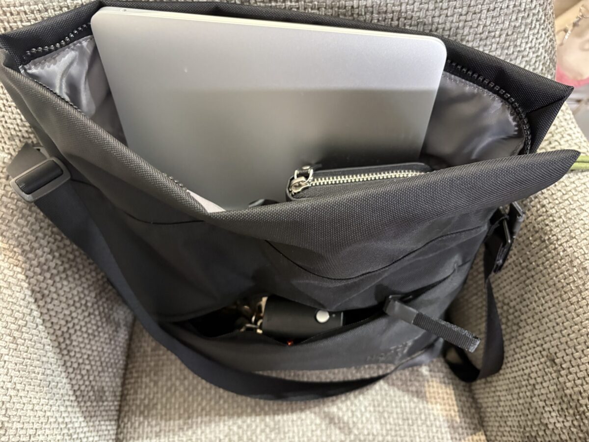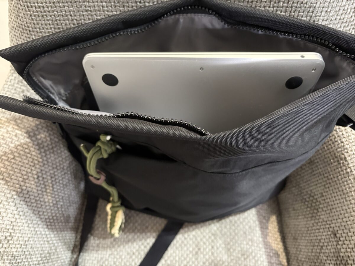 試しにMacBook 13インチを縦に入れてみたところ、ちゃんと収まりました。しかも、そのままマウスや充電器、財布も一緒に入れられます。バッグとして使いながら、「ほぼPCケースじゃないか」と思った場面が何度かあります。