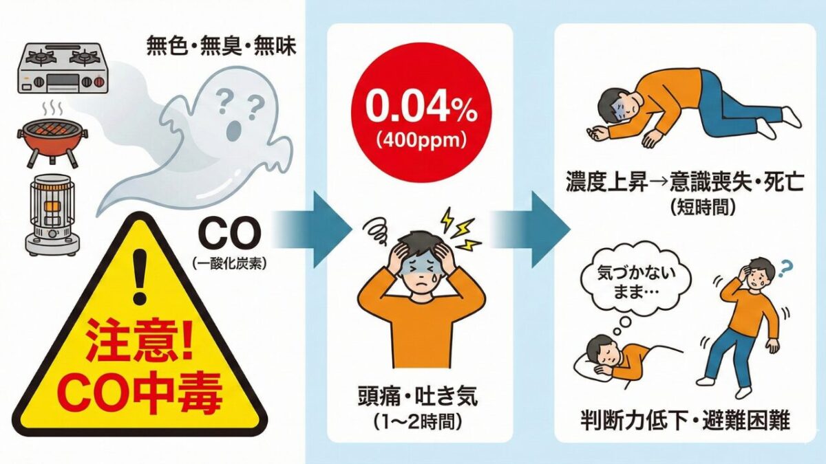 一酸化炭素はプロパンガスのように床を這う性質ではないため、検知が遅れるリスクがあります。